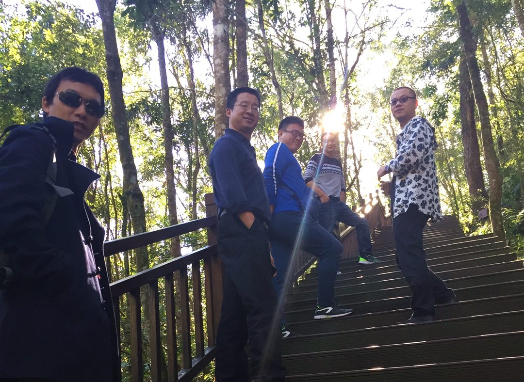 普洱国家森林公园清新温暖的空气让人神清气爽,高高的森林将阳光切成一缕一缕,大家一致决定徒步行走一段路程,去感受热带雨林的魔力和神奇。