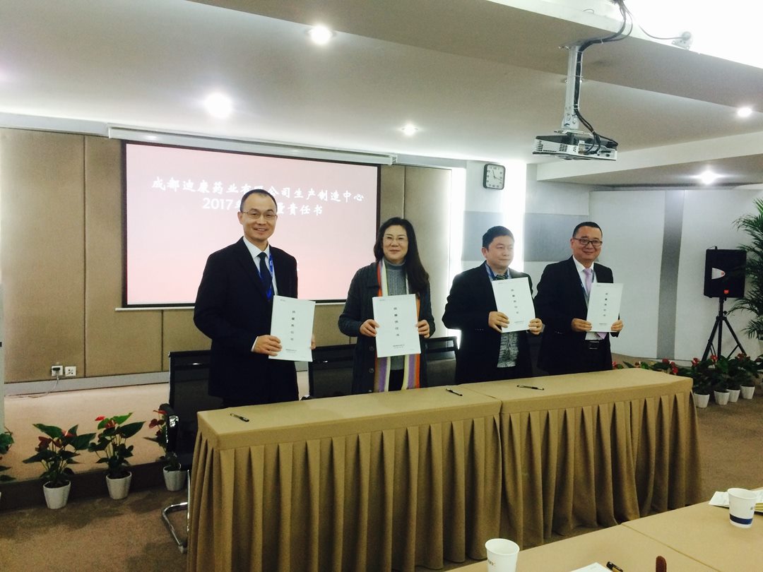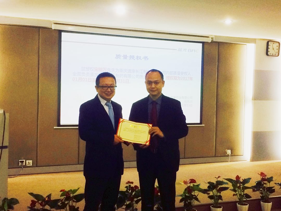 会上,迪康药业总裁杜曙光先生代表迪康药业与生产制造中心、迪康中科、迪康长江及迪康拉萨管理团队签订《质量责任书》。蓝光生命科技集团董事长任东川先生向生产制造中心、迪康中科、迪康长江、营销管理中心及迪康拉萨相关负责人颁发内部管理《质量授权书》,并对2016年度产品质量市场维护方面有突出贡献的销售人员进行表彰。