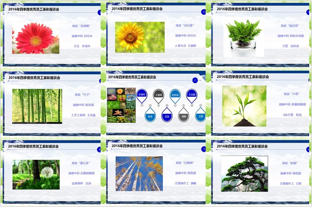 近日,迪康中科举办了2016年四季度A级优秀员工表彰座谈会,此次座谈会特邀请迪康药业总裁助理兼研发管理中心总经理周桂梅女士出席,同时参会人员还有迪康中科主管级及以上人员、4季度优秀员工等二十余人。为了让优秀员工更多的展示自己,也为了把座谈会变得“有意思”,此次的表彰会设计成为“植物主题”座谈会,以“我是XXX植物”展开了自己的经验分享,下面就带着大家看一看我们的植物园,到底这些可爱的植物说了些什么呢?