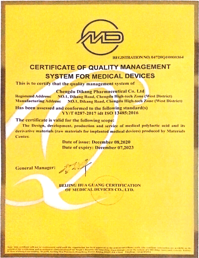 目前,拥有18项专利技术和5项CFDA注册证,并于2017年通过GB/T 19001-2016 idt ISO 9001:2015和YY/T 0287-2017 idt ISO 13485:2016双重认证,合成中心材料生产的三类植入医疗器械已上市20余年,临床已安全使用200余万例。